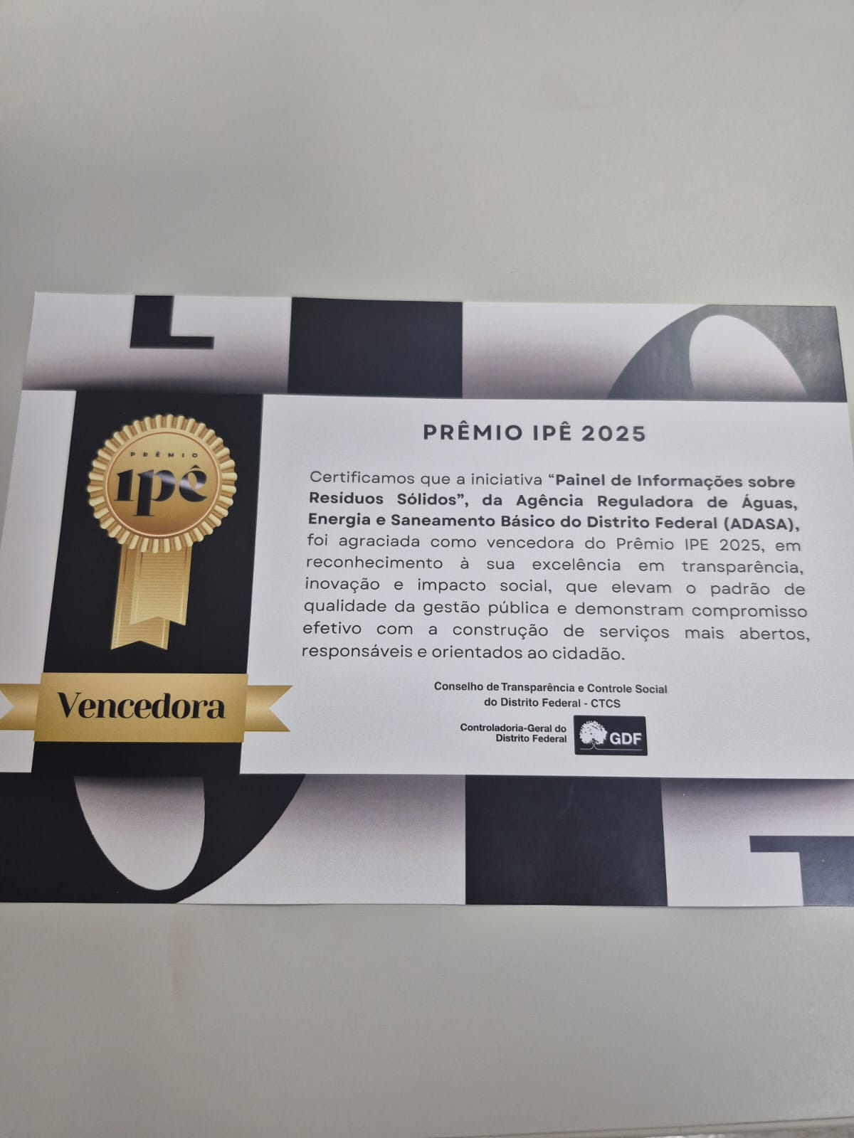 Nesta segunda feira, 24 de Novembro, a Agência Reguladora de Águas, Energia e Saneamento Básico do DF (Adasa) conquistou o Prêmio Ipê de Inovação em Transparência 2025 promovido pelo Governo do Distrito Federal (GDF) com o Painel de Informações sobre Resíduos Sólidos.
